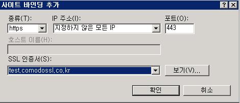 | ※ 주의하셔야 할 사항 (ex:abc.com 인증서 구입 받은후 https://XXX.abc.com 접속시 인증서 오류 발생) www. 인증 가능, 단 IE 에서 주체 대체 이름 지원하지 않을겨우 인증 되지 않음. 해결 방안: 보안서버구축 가이드 읽어 보시면 소스 수정(리다이렉션, 보안로그인 창 생성) 및 도메인별 사이트 분활 셋팅 으로 오류 해결 가능. = SecureBindings 역시 한사이트에 한개의 도메인만 가능합니다. 이유:식별자값이 하나만존재 = 싱글 도메인 인증서 는 SecureBindings 기능을 지원하지 않아 사이트의 포트를 각각 다르게 주셔야 합니다. = 포트를 다르게 주었을 경우 (https://도메인주소:포트번호) 확인하셔야 합니다. ※SecureBindings 기능 (멀티 도메인 인증서 설치 안내 참고)