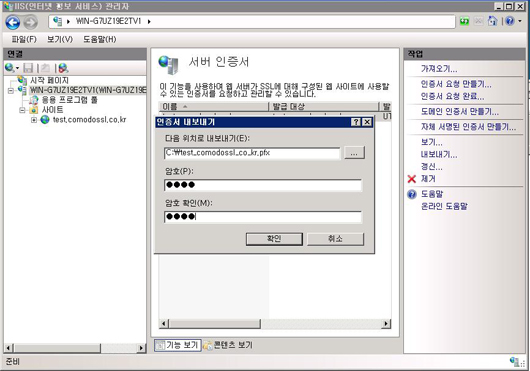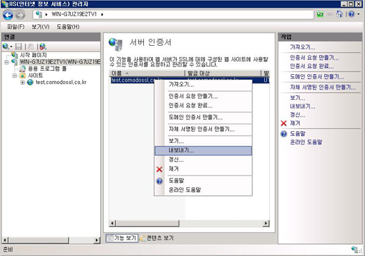 [3] 보안 인증키 백업 *인증서 설치후에는 필히! 백업(개인키포함)을 한후 별도의 안전한 곳에 보관을 해야 합니다. 인증서을 백업하지 않은 상태에서 서버 재세팅시(개인변경) 복구가 되지 않으므로 인증서를 백업해야 하며, 기존 발급된 인증서로는 재설치가 되지 않습니다. (*인증서 발급후 30일 이후에는 재발급이 되지 않으므로 절대 주의가 필요합니다.!) 보안 인증키 백업을 통하여 만약의 사태를 대비 하시길 바랍니다. 1.iis 서버 인증서에서 내보내기 클릭.