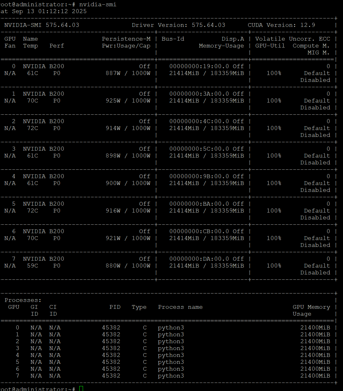 B200 제품의 경우 스펙이 180GB이며  전력 소비량은 개당 1000W (1KW)이다